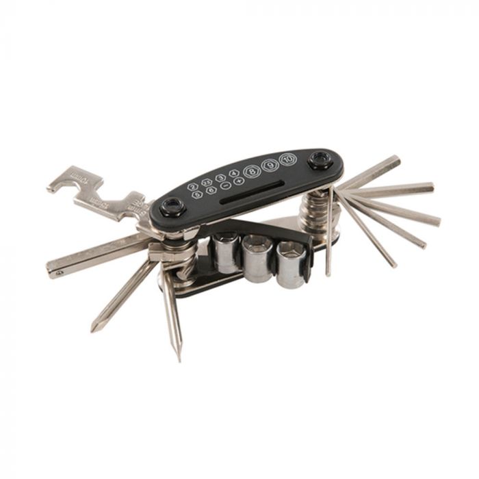 L'Outil Multifonction Vélo de Silverline est un outil complet 13 fonctions intégrant divers outils pouvant être utiles pour effectuer une réparation ou simplement reserrer une vis mal fixée. Avec son étui en tissu avec passant de Ceinture, il peut être emmené partout. Un outil tout-terrain pour rouler sereinement.