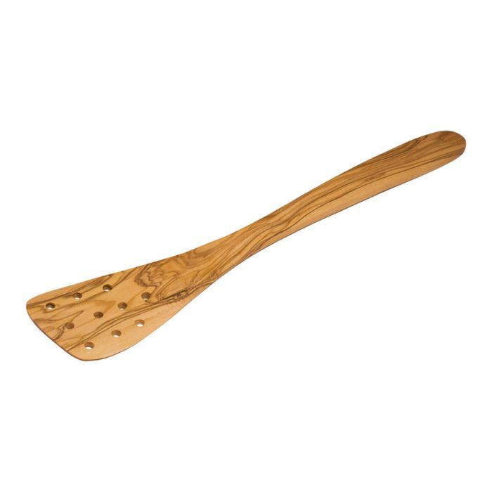 La spatule de cuisine perforée Redecker est en bois d'olivier huilé.